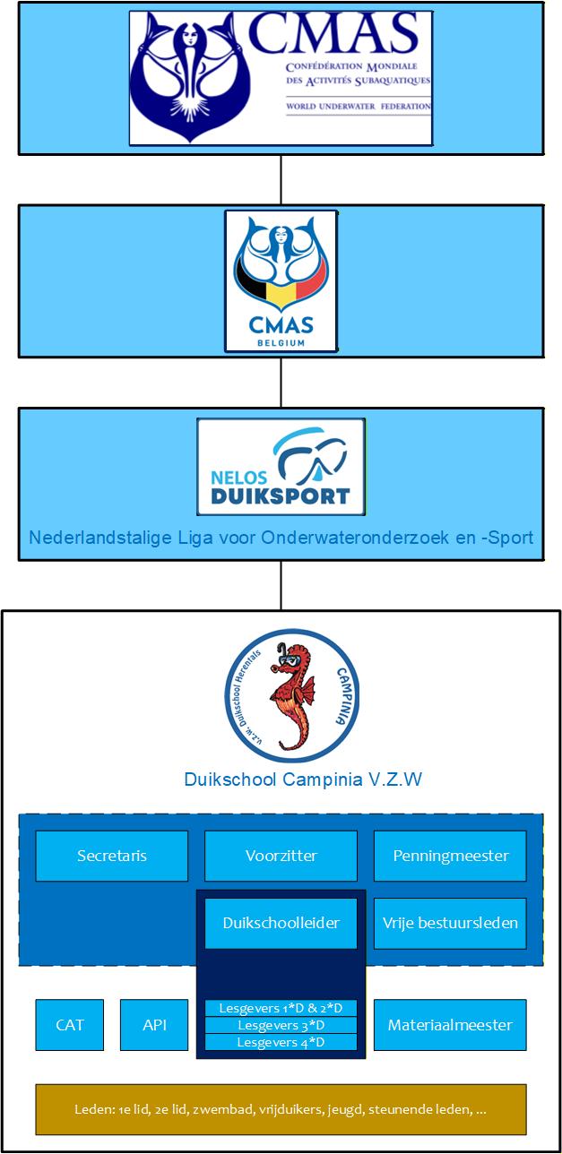 Wij willen je graag onze Kempische Duikschool Campinia voorstellen. Campinia is een v.z.w. die werd opgericht in 1981 en is aangesloten bij NELOS (Nederlandstalige Liga voor Onderwateronderzoek en sport). NELOS is op zijn beurt aangesloten bij het globaal overkoepelend orgaan voor de duiksport, CMAS genaamd (Conféderation Mondiale des Activités Subaquatiques), met als gevolg dat alle brevetten die bij Campinia worden behaald wereldwijd erkend zijn.
